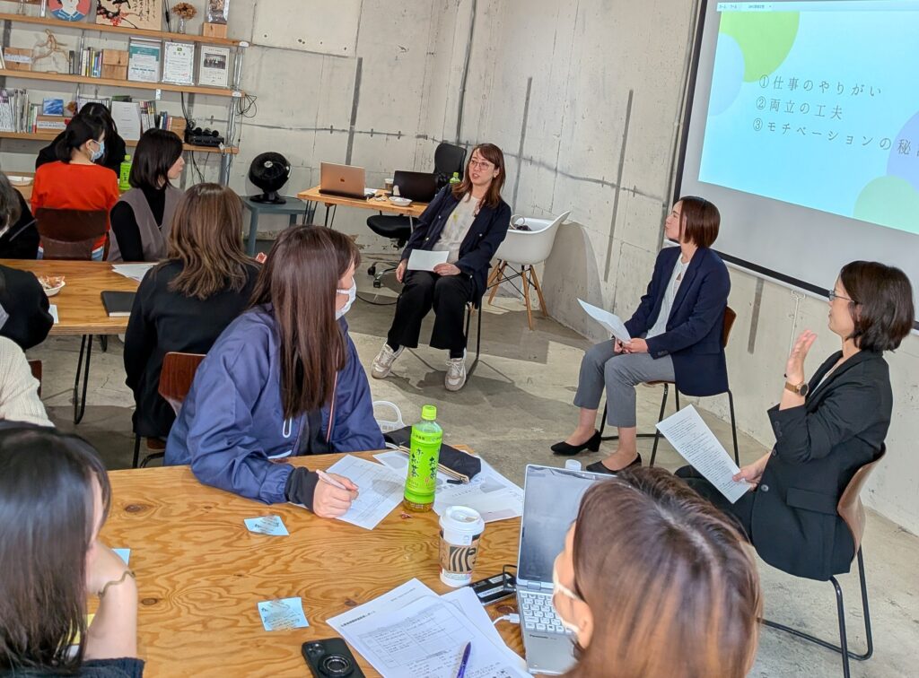 後半は、実際に県内企業で活躍されている職種・働き方・家庭環境が異なる2名のゲストをお迎えし、パネルディスカッションを実施しました。パネラーのお二人には、仕事と家庭のバランスのとり方や価値観について、仕事でモチベーションがあがったときの経験談から趣味のことまで広く触れながら、ざっくばらんに話していただきました。